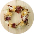 ナチュラル感たっぷりのリース。使用している紅葉は、プリザーブド加工された、生き生きとした葉です。オレンジのアジサイを加え、あたたかい印象に仕上げました。