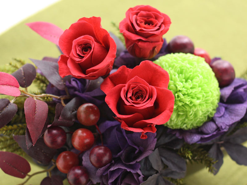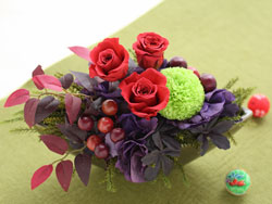 ●和アレンジ ローズルージュ カーキベース商品コード:PAM7_00181 人気の和アレンジシリーズのローズルージュアレンジです。 サイズは小ぶりですが、すっきりとまとまって大人っぽい赤バラ、ローズルージュが華やかでお祝用などにピッタリです。 サイズ:たて約13cmxよこ約18cmxおく約10cm 定 価:
